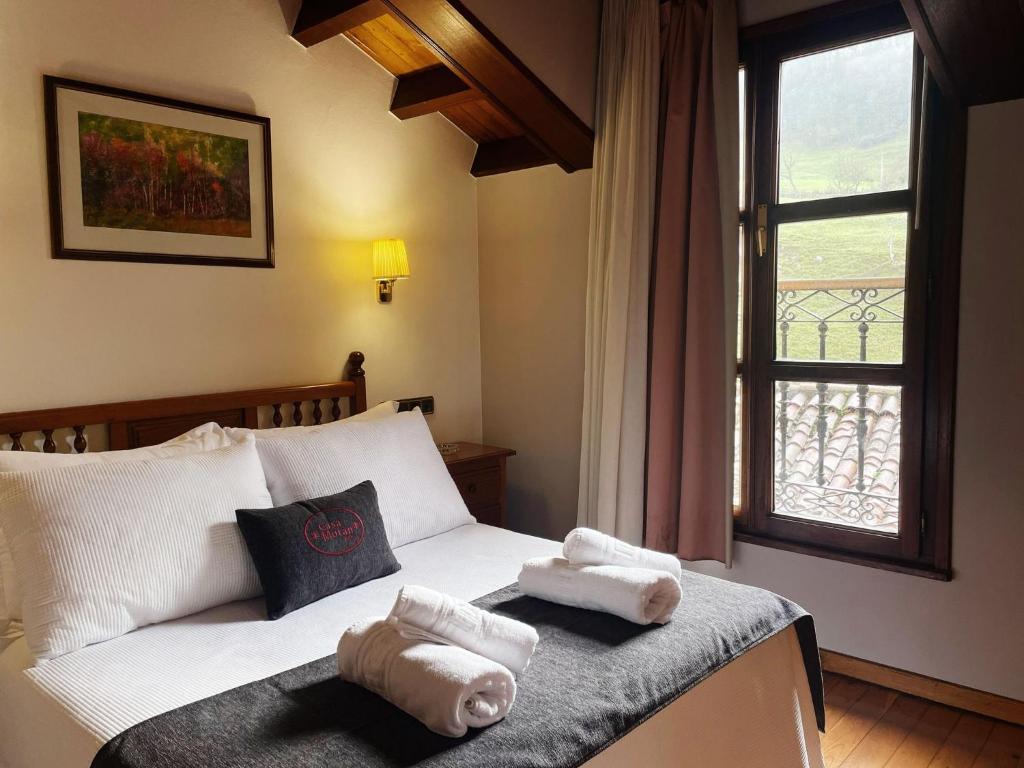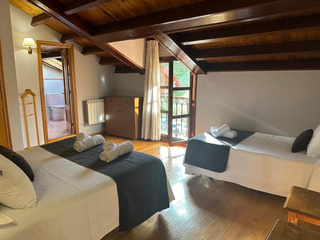 Nuestra habitación doble ofrece un espacio amplio y confortable, ideal para parejas que buscan comodidad y tranquilidad. Decorada con el estilo tradicional asturiano, combina elementos rústicos con las comodidades modernas. La habitación cuenta con una cama doble de gran tamaño, armario espacioso y baño privado completo. Las vistas a la montaña desde la ventana crean un ambiente relajante perfecto para descansar después de un día de turismo por los Picos de Europa.